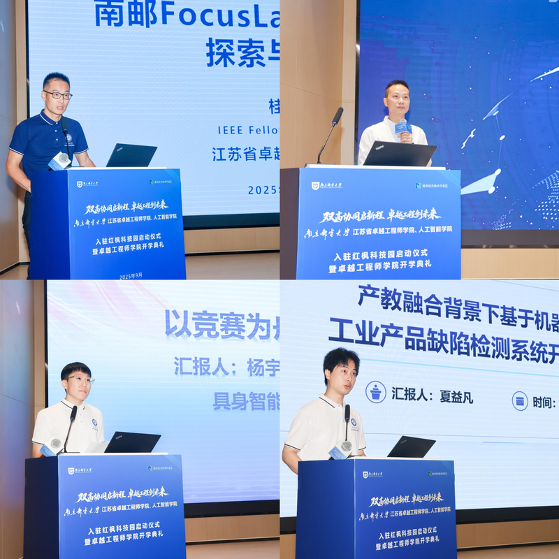 “融合・共创”篇章中,南邮卓工学院导师代表桂冠教授分享了FocusLab产教融合的发展与思考,2024级硕士研究生杨宇豪、尤晓磊、王鸿毅组成的研电赛国奖团队进行获奖作品路演。“聚力・前行”篇章中,卓工学院2025级博士研究生夏益凡展现了将学术前沿与产业需求衔接的创新思维与工程能力,中信科烽火云科技有限公司副总经理赵国展望了校企协同人才培养的未来。